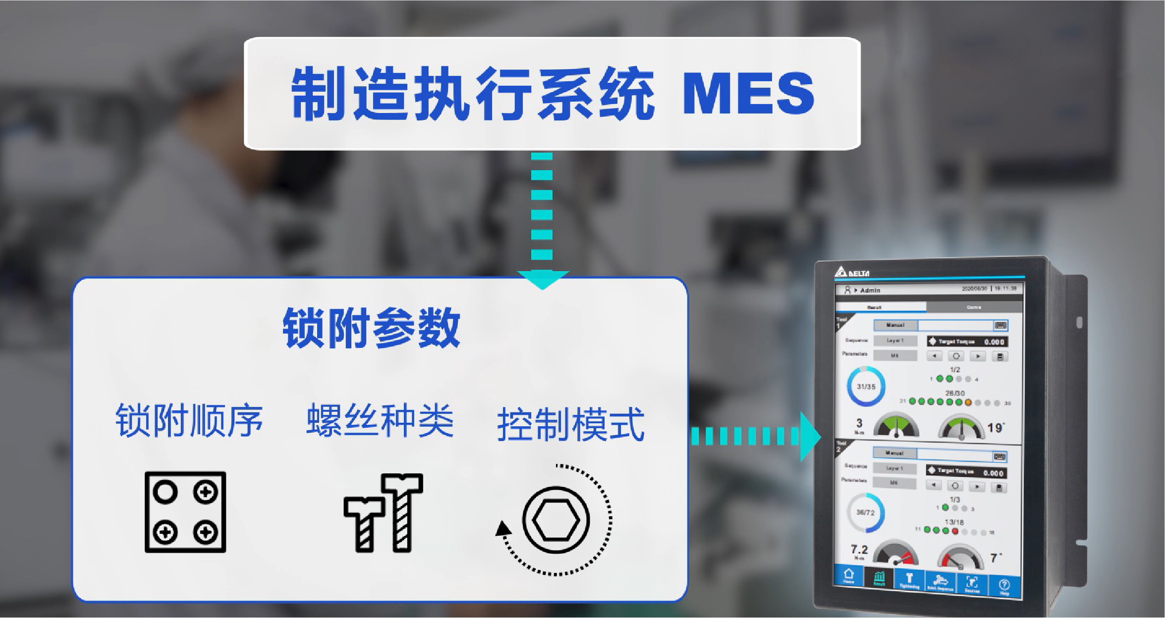 管理人員通過制造執行系統 (MES) 將工單下載到智能螺絲鎖附系統,系統會根據預先設定的動作自動執行鎖螺絲作業,工藝操作實現智能化。