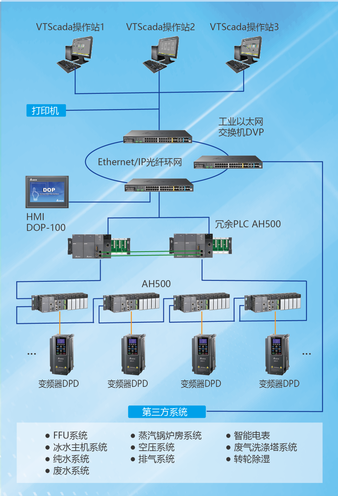 3、應用冗余型PLC AH500搭載變頻器DPD組成冗余控制系統,實現對空調系統、冷卻水塔等第三方系統的數據與流量調節;聯動主監控系統,進行精密控制,為潔凈室的調溫、調濕等提供精細化控制。
